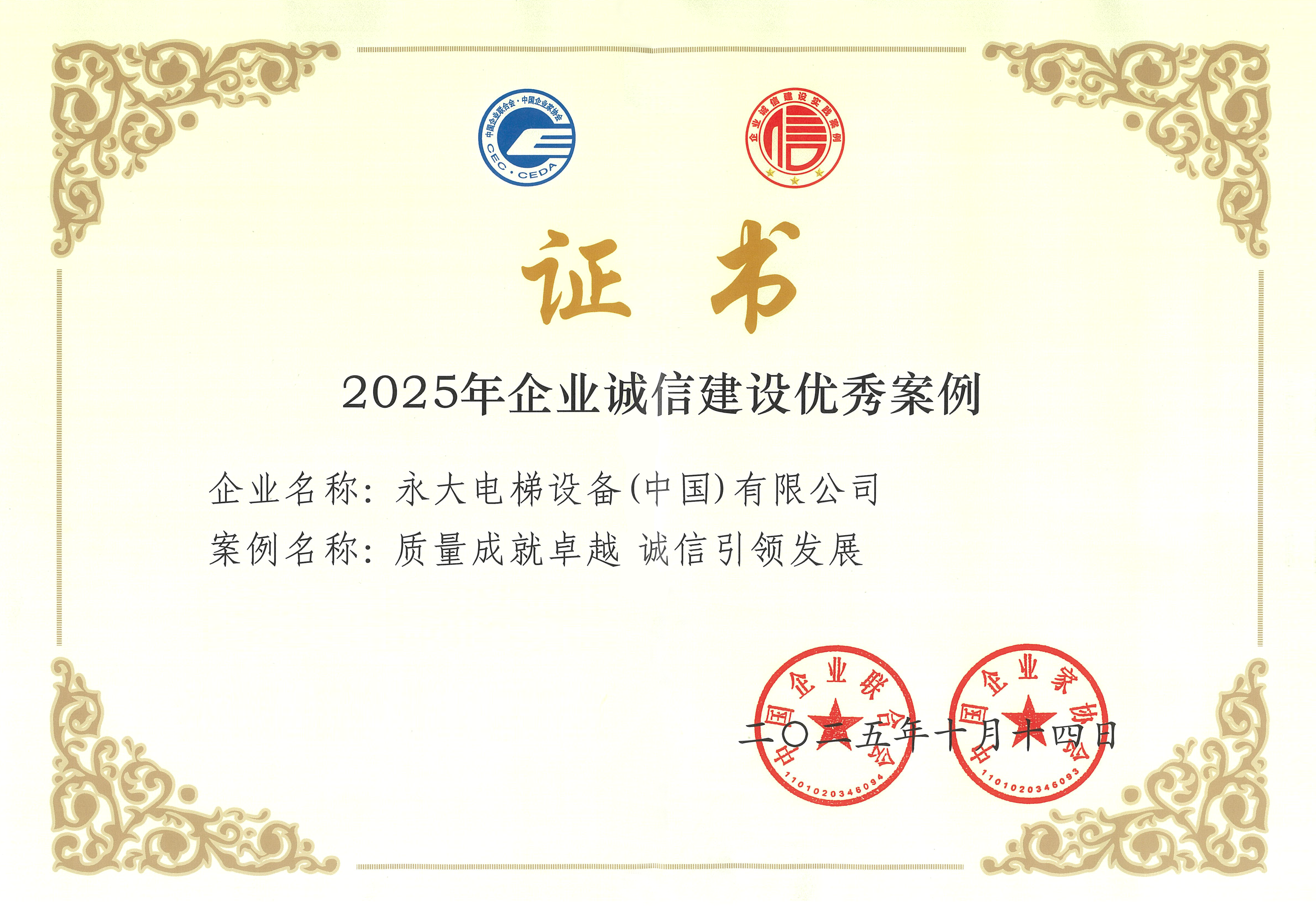 此次榮獲“2025年企業誠信建設優秀案例”,是對永大電梯誠信建設成果的肯定。永大將進一步踐行誠信精神,弘揚誠信文化,切實履行企業社會責任,助力構建更加誠信、和諧的行業氛圍與社會環境。